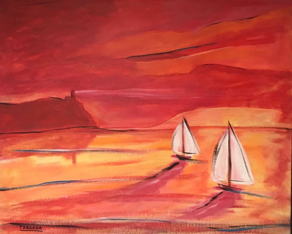 A DOS VELAS es un reflejo de lo que digo. Mar y cielo rojo, con mostaza. Blanco de vela al viento, viento en popa. Puesta de sol sin sol. Luz de sábado noche. Un mar que no da frío, ahora que casi hemos olvidado que antes de ayer fue estío.
